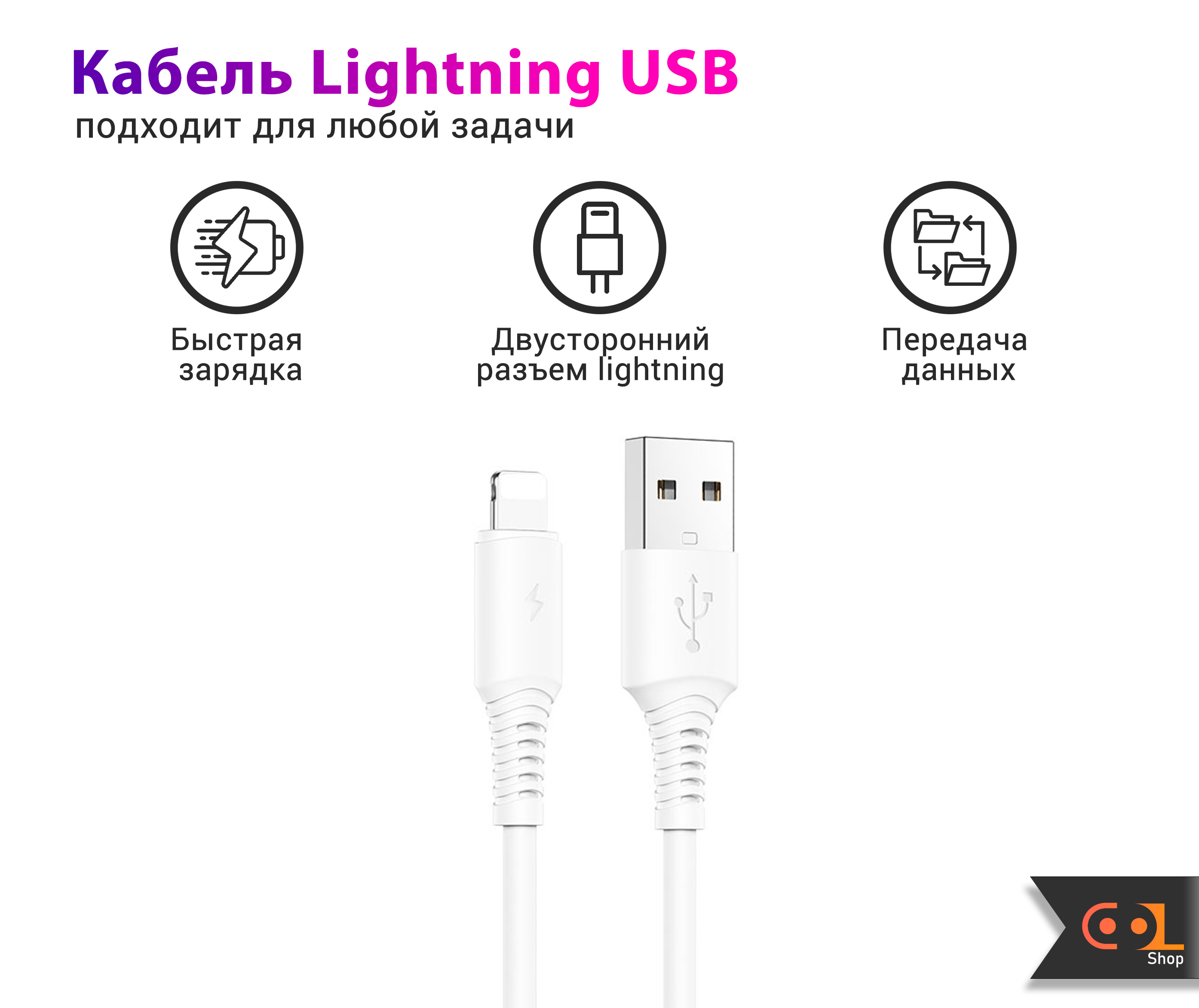 Кабель USB - Lightning (1 метр, 3 Ампера, силикон) - Плоский