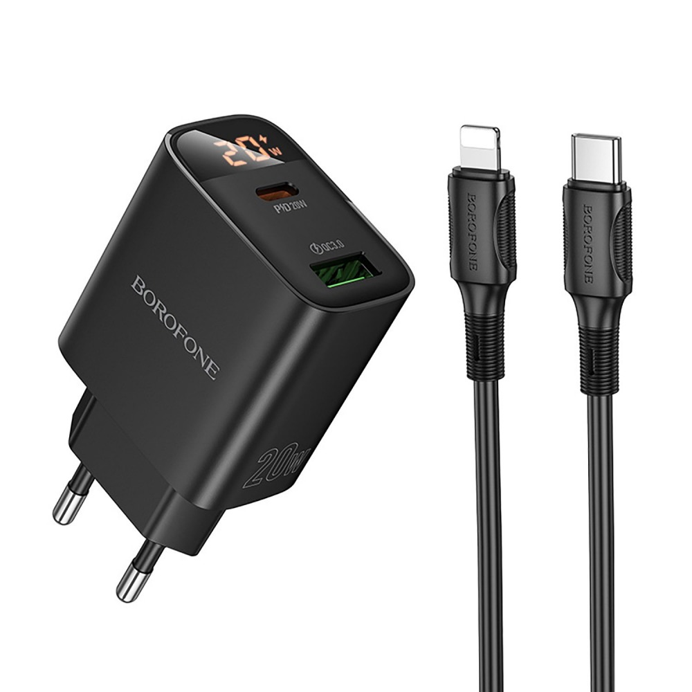 Зарядное сетевое Usb A + Usb C (20W, QC 3.0) + кабель Type-C - Lightning в комплекте