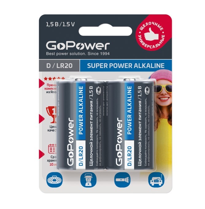 Элемент питания GoPower LR20 BL2 Alkaline 1.5V (2/12/96)
