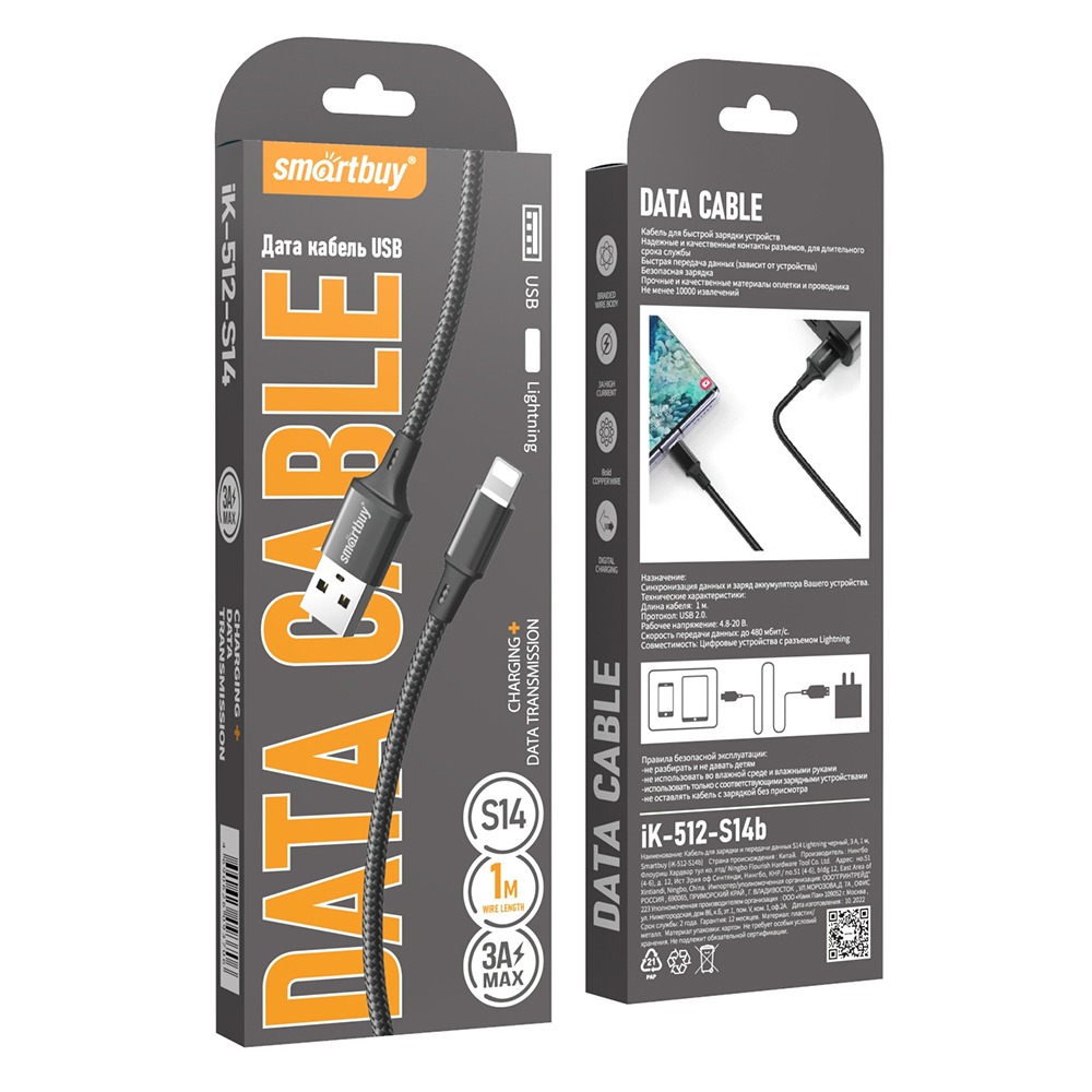 Кабель для зарядки и передачи данных S14 Lightning черный, 3 А, 1 м, Smartbuy (iK-512-S14b)