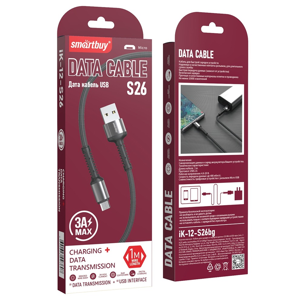 Кабель для зарядки и передачи данных S26 MicroUSB черн./сер., 3 А,QC,нейл.,1м,Smartbuy (iK-12-S26bg)