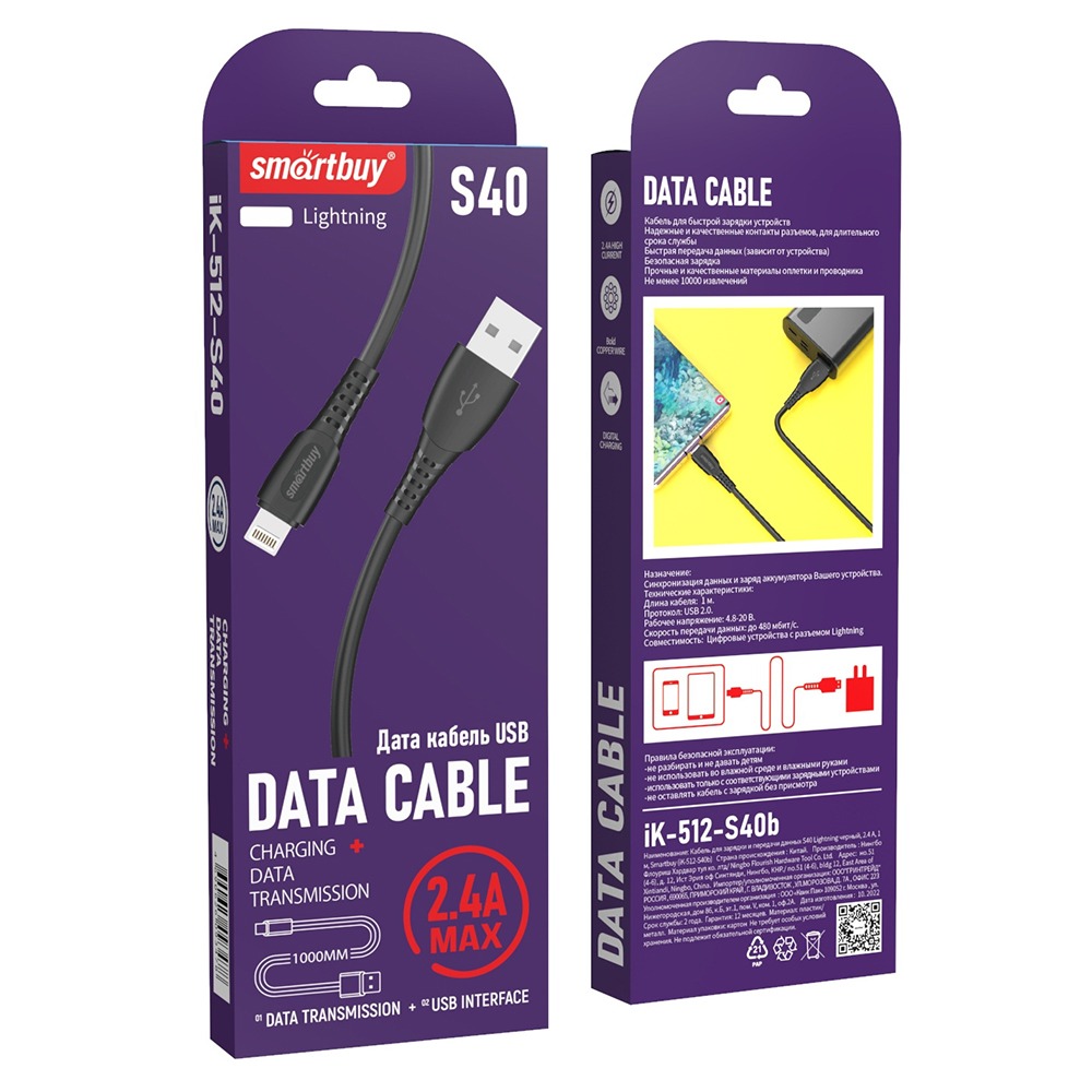 Кабель для зарядки и передачи данных S40 Lightning черный, 2.4 А, 1 м, Smartbuy (iK-512-S40b)