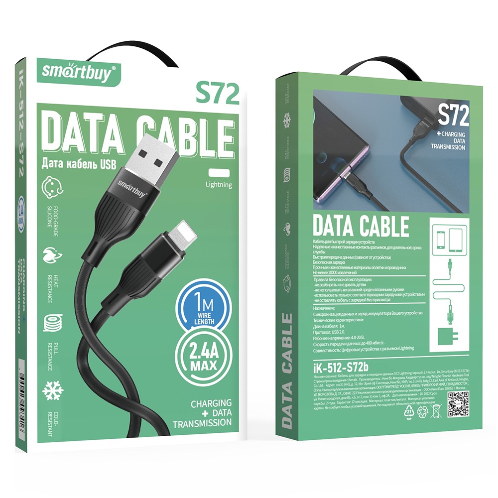 Кабель для зарядки и передачи данных S72 Lightning черный, 2.4 А,сил., 1 м, Smartbuy (iK-512-S72b)