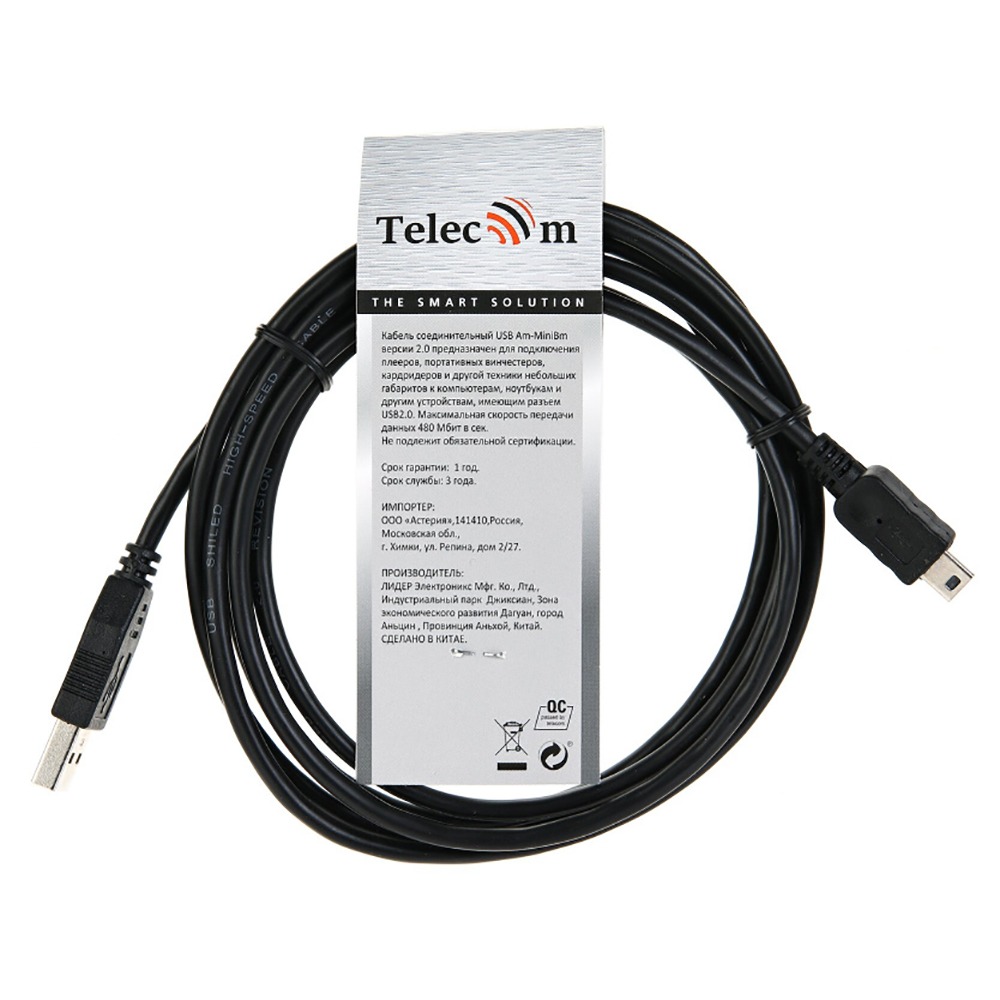 Кабель USB 2.0 A-->mini-B 5P (1,8м) чёрный, Telecom
