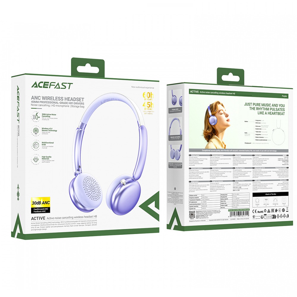Наушники полноразмерные ACEFAST H8, ANC, bluetooth 5.4, 500mAh, цвет: фиолетовый (1/72)