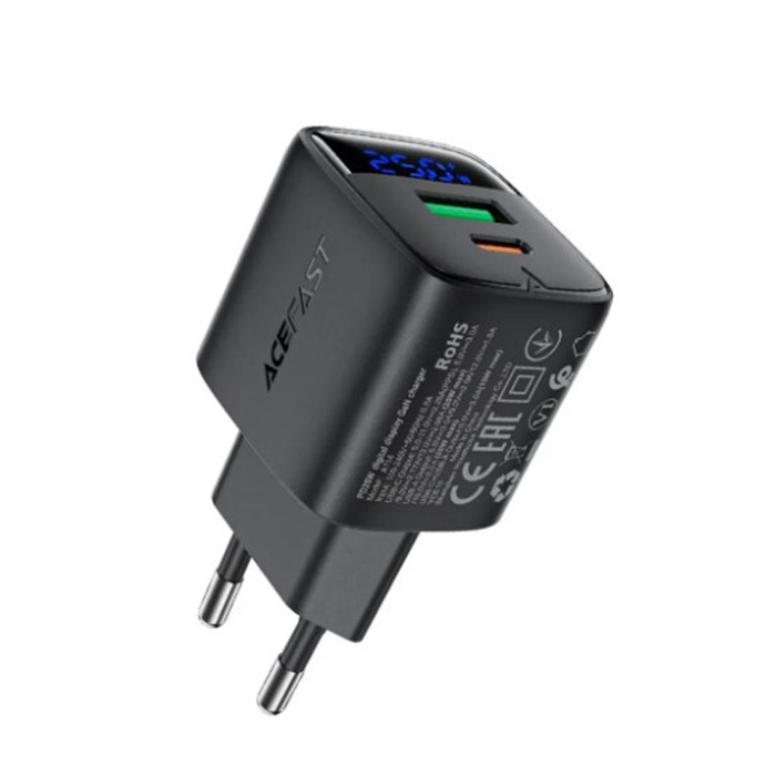 Сетевое зарядное устройство USB/Type-C Acefast A114 (25W, QC3.0, PD, 2 порта, GaN, с дисплеем) Черный