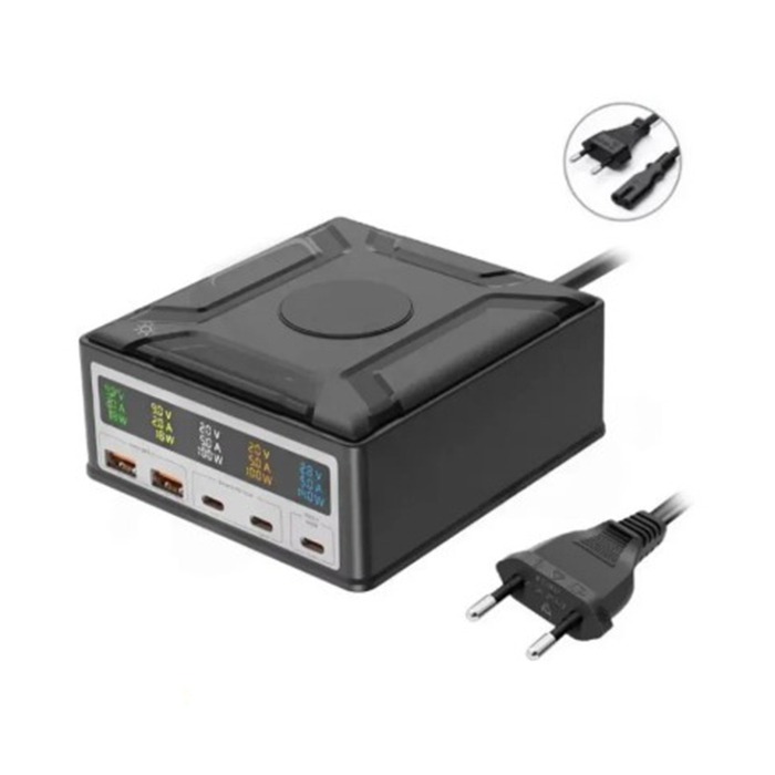 Зарядная станция GaN (260W, 5 портов, 2USB-QC3.0/3Type-C-PD3.1, Qi 15W, LCD)